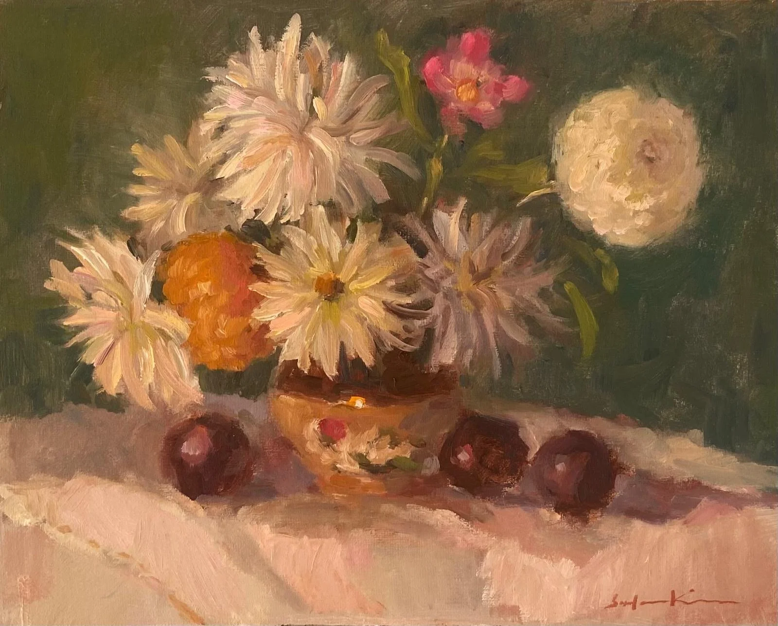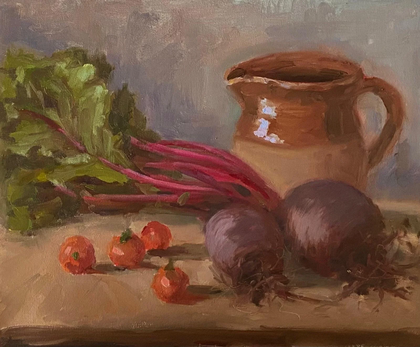 This artwork is a still life featuring a rustic ceramic jug alongside freshly harvested vegetables arranged on a tabletop. Earthy reds, purples, and greens—beetroots with tangled roots, leafy stems, and small tomatoes—are painted with loose, expressive brushstrokes that emphasize texture and form. The soft, muted background and gentle play of light give the scene a warm, intimate feel, celebrating the simple beauty of everyday objects.