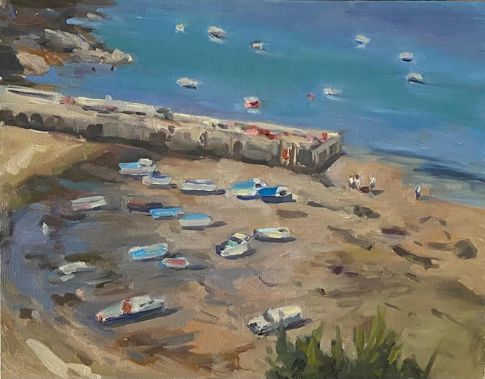 This painting depicts a quiet coastal harbor seen from above, with small boats scattered across a sandy shoreline and gently floating on calm blue water. A stone pier curves into the sea, its arches and muted tones anchoring the composition, while tiny figures suggest leisurely human presence. Loose, impressionistic brushstrokes and soft, natural colours create a serene, sunlit atmosphere, capturing the stillness and charm of a seaside village at rest.