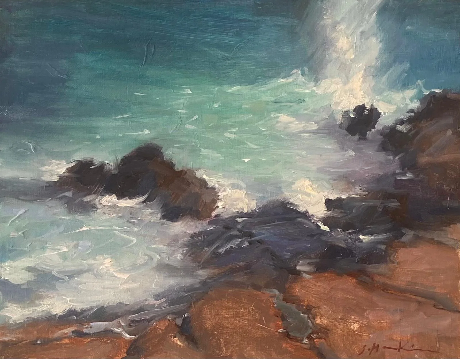 This artwork captures the restless dialogue between sea and stone, where foaming waves surge against dark, weathered rocks under a cool, shifting sky. Broad, expressive brushstrokes and a muted palette of blues, greens, and earthy browns convey movement and atmosphere rather than fine detail, giving the scene a raw, elemental energy. The painting feels both tranquil and powerful, evoking the timeless rhythm of nature and the quiet drama of a rugged coastline.